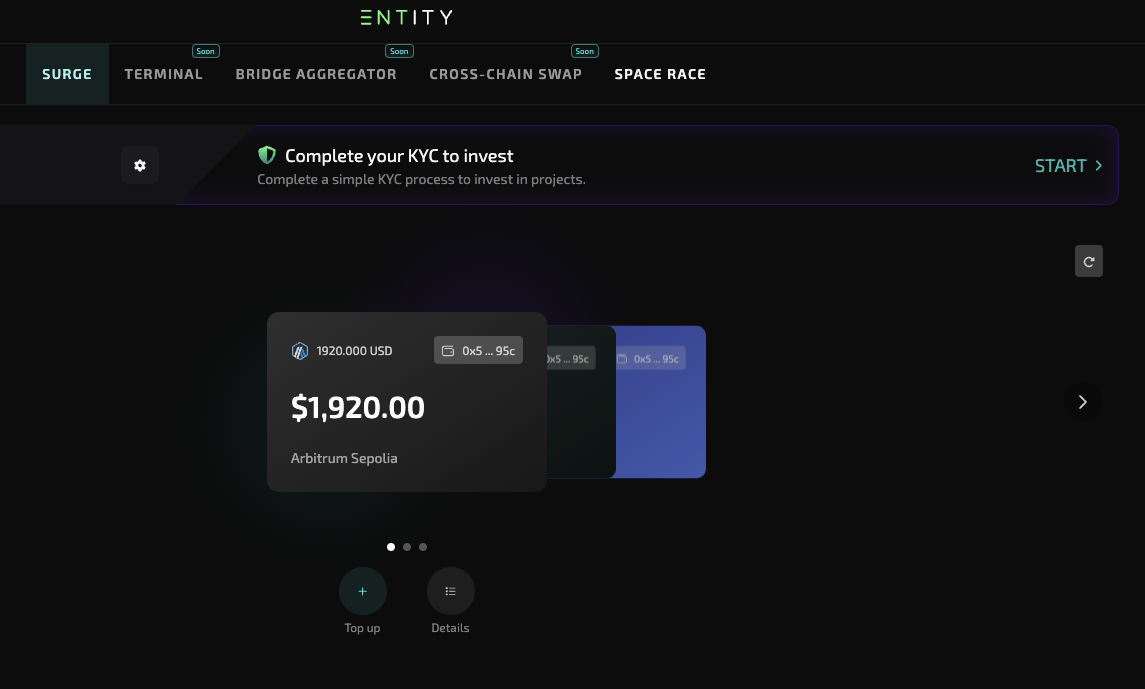 <figure><img src="https://2638771456-files.gitbook.io/~/files/v0/b/gitbook-x-prod.appspot.com/o/spaces%2Fb24XHjyRSlLDpgpmTbZC%2Fuploads%2FicxteWUHmHl2lkpJKPu9%2Fimage.png?alt=media&#x26;token=844916a2-20b7-45e2-a3b2-7f06fcc15e79" alt=""><figcaption><p>The Start KYC option will only appear if you have a <a href="https://entity.gitbook.io/entity/what-is-entity/surge/pro-testing">Pro Voucher</a></p></figcaption></figure>